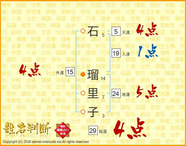 石(5画) 瑠(14画)里(7画)子(3画)