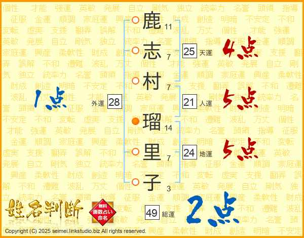 鹿(11画)志(7画)村(7画) 瑠(14画)里(7画)子(3画)