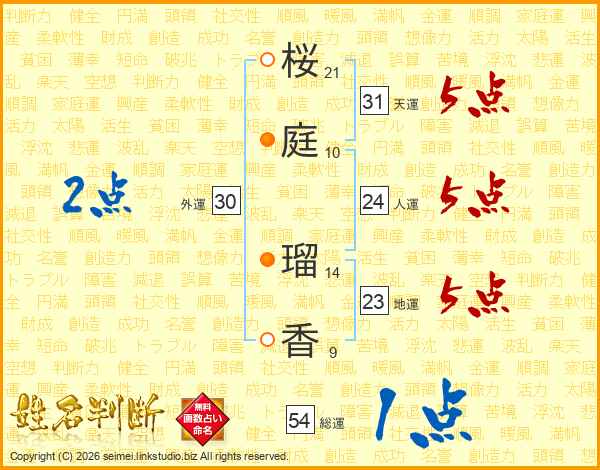 桜(21画)庭(10画) 瑠(14画)香(9画)