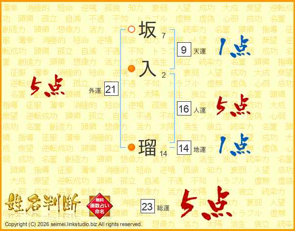 坂(7画)入(2画) 瑠(14画)