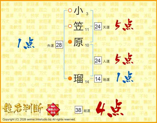 小(3画)笠(11画)原(10画) 瑠(14画)