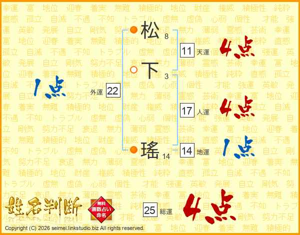 生活面を象徴する運勢です。外部から受ける影響力を表し、結婚運、家庭運や職場、環境への順応性を表します。総運から人運を引いた画数。姓や名が1文字の場合を除く。