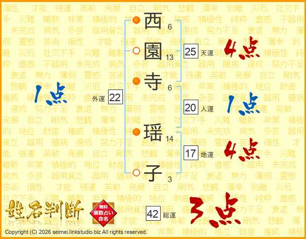 西(6画)園(13画)寺(6画) 瑶(14画)子(3画)