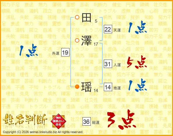 田(5画)澤(17画)  瑶(14画)
