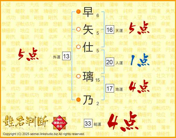 早矢仕璃乃さんの総運は33画の4点!