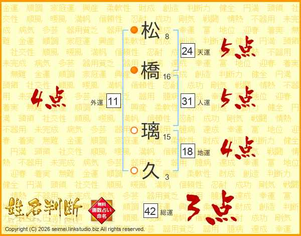あなたの人生を表す1番重要な運勢です。生涯を通じて影響する総合運となり、主に50歳以降の晩年期に影響を及ぼします。苗字と名前の合計画数。