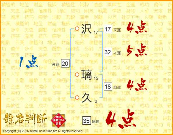 生活面を象徴する運勢です。外部から受ける影響力を表し、結婚運、家庭運や職場、環境への順応性を表します。総運から人運を引いた画数。姓や名が1文字の場合を除く。