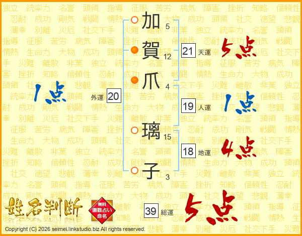 加(5画)賀(12画)爪(4画) 璃(15画)子(3画)