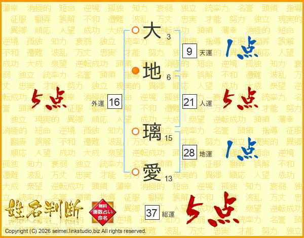 生活面を象徴する運勢です。外部から受ける影響力を表し、結婚運、家庭運や職場、環境への順応性を表します。総運から人運を引いた画数。姓や名が1文字の場合を除く。