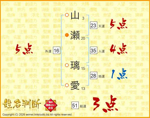 山(3画)瀬(20画) 璃(15画)愛(13画)