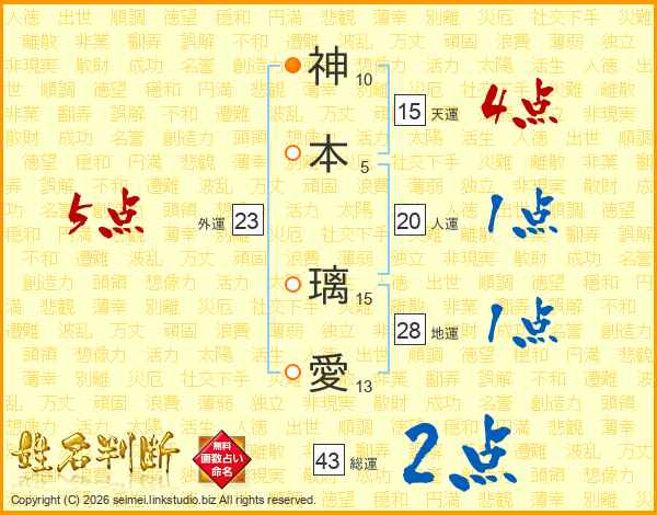 あなたの人生を表す1番重要な運勢です。生涯を通じて影響する総合運となり、主に50歳以降の晩年期に影響を及ぼします。苗字と名前の合計画数。