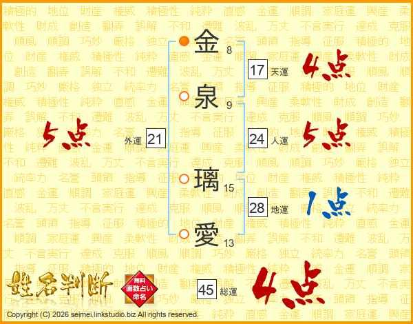 金(8画)泉(9画) 璃(15画)愛(13画)