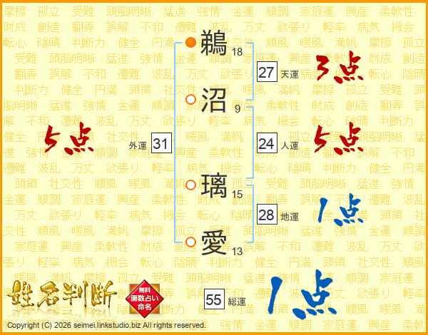 鵜(18画)沼(9画) 璃(15画)愛(13画)