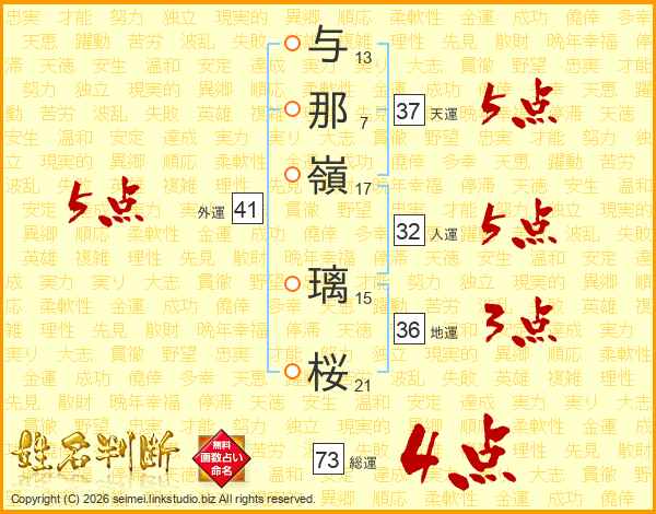 与(13画)那(7画)嶺(17画) 璃(15画)桜(21画)