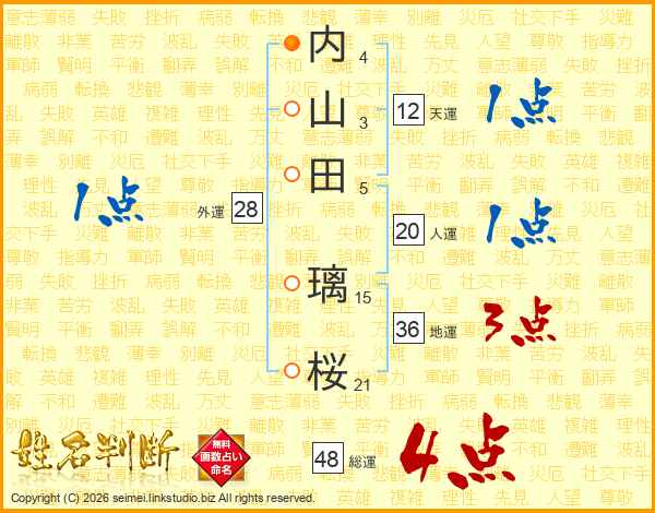 内(4画)山(3画)田(5画) 璃(15画)桜(21画)