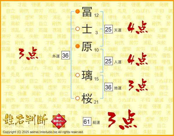 冨(12画)士(3画)原(10画) 璃(15画)桜(21画)