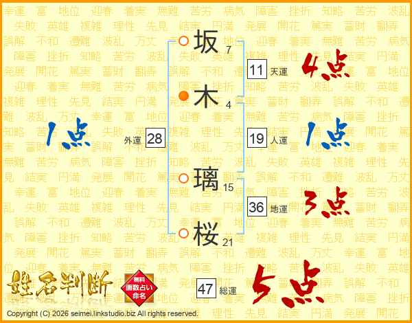 坂(7画)木(4画) 璃(15画)桜(21画)