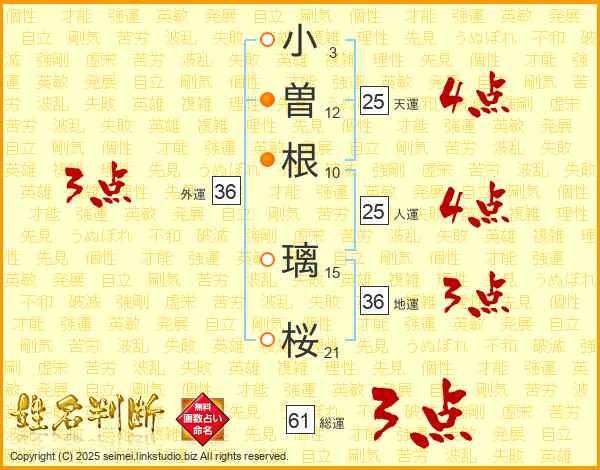 小(3画)曽(12画)根(10画) 璃(15画)桜(21画)