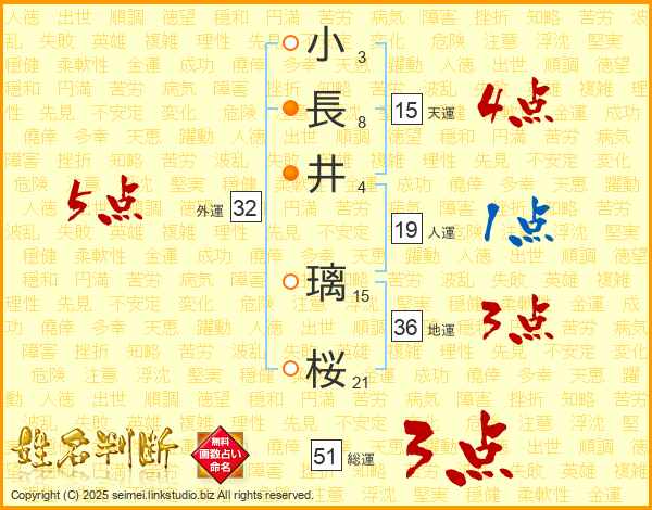 小(3画)長(8画)井(4画) 璃(15画)桜(21画)