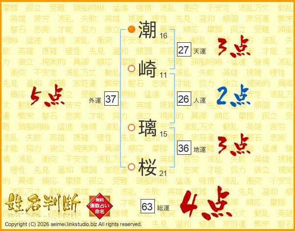 潮(16画)崎(11画) 璃(15画)桜(21画)