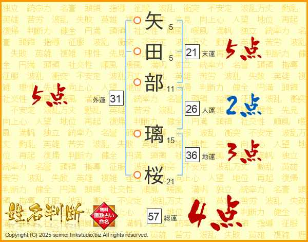 矢(5画)田(5画)部(11画) 璃(15画)桜(21画)