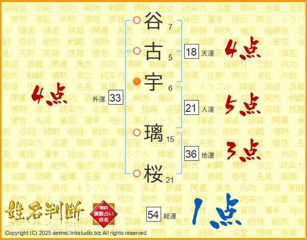 谷(7画)古(5画)宇(6画) 璃(15画)桜(21画)
