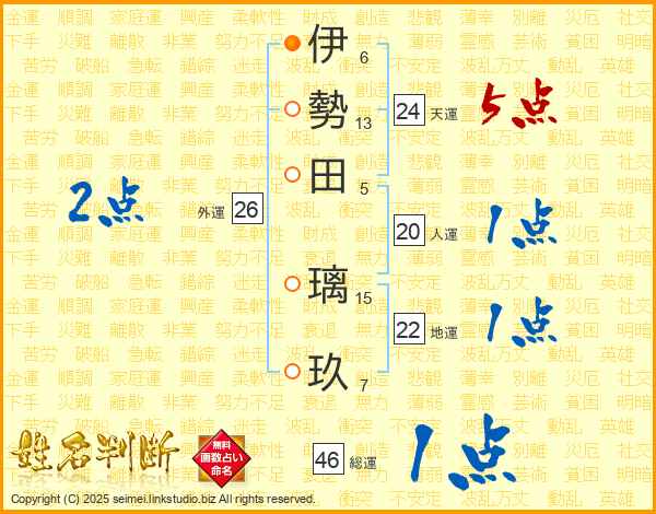 伊(6画)勢(13画)田(5画) 璃(15画)玖(7画)