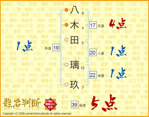 八木田璃玖さんの総運は39画の5点!