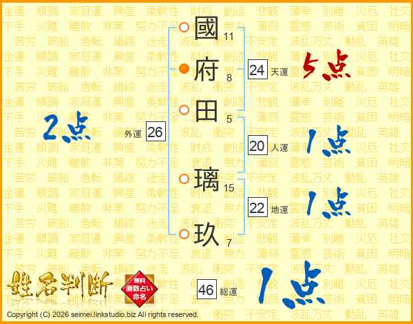 國(11画)府(8画)田(5画) 璃(15画)玖(7画)