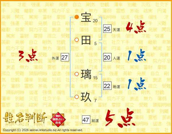 宝(20画)田(5画) 璃(15画)玖(7画)