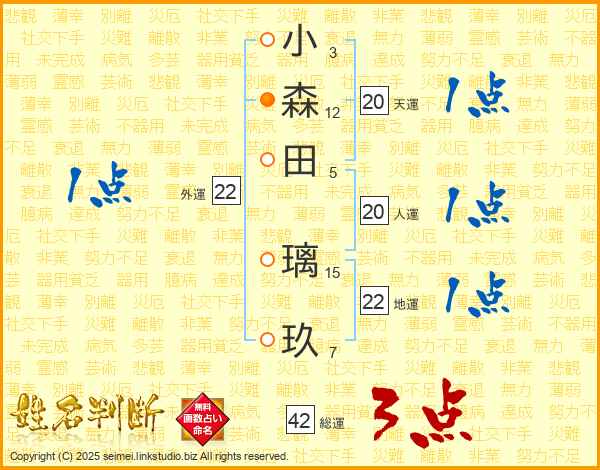 小(3画)森(12画)田(5画) 璃(15画)玖(7画)
