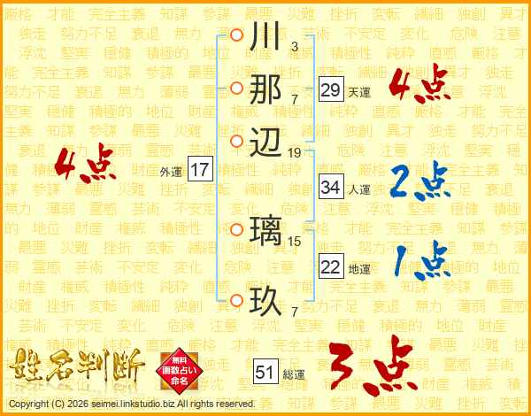 川(3画)那(7画)辺(19画) 璃(15画)玖(7画)