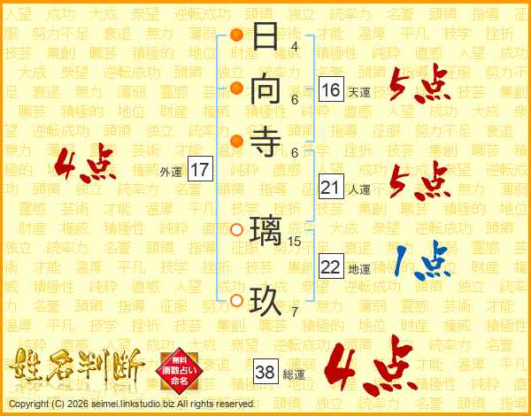 日(4画)向(6画)寺(6画) 璃(15画)玖(7画)