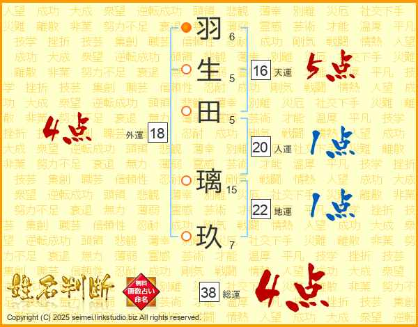 羽(6画)生(5画)田(5画) 璃(15画)玖(7画)