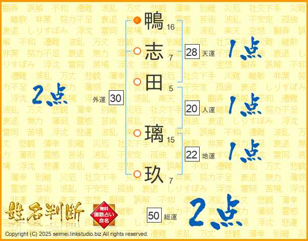 鴨(16画)志(7画)田(5画) 璃(15画)玖(7画)