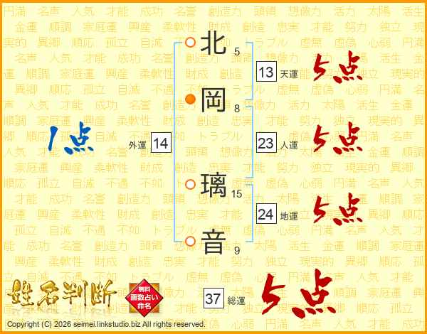 北岡璃音さんの総運は37画の5点!