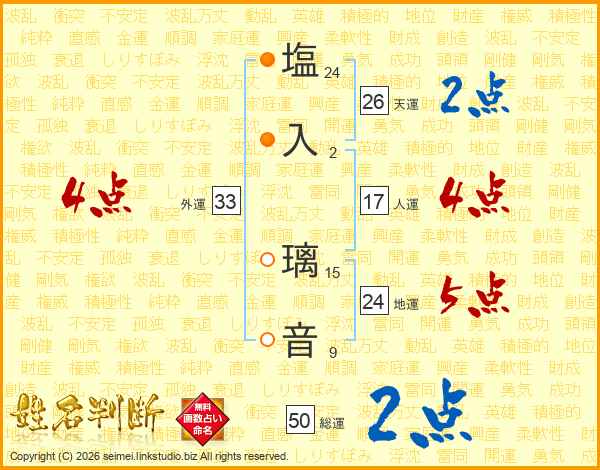 塩(24画)入(2画) 璃(15画)音(9画)
