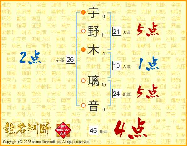 宇(6画)野(11画)木(4画) 璃(15画)音(9画)