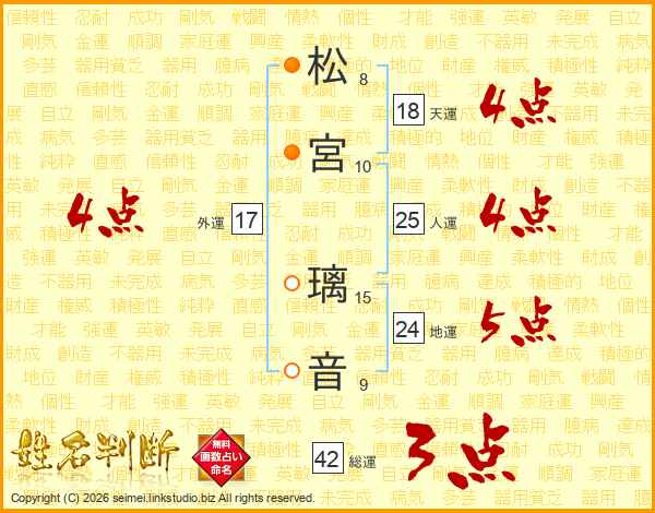 松(8画)宮(10画) 璃(15画)音(9画)