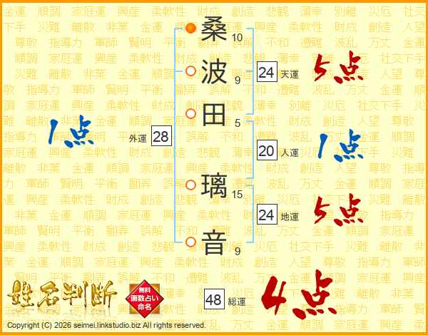 桑(10画)波(9画)田(5画) 璃(15画)音(9画)