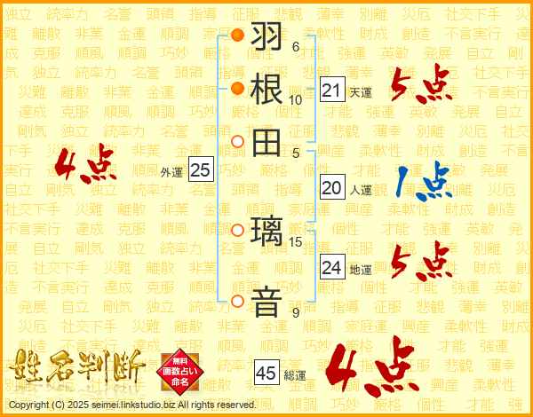 羽(6画)根(10画)田(5画) 璃(15画)音(9画)