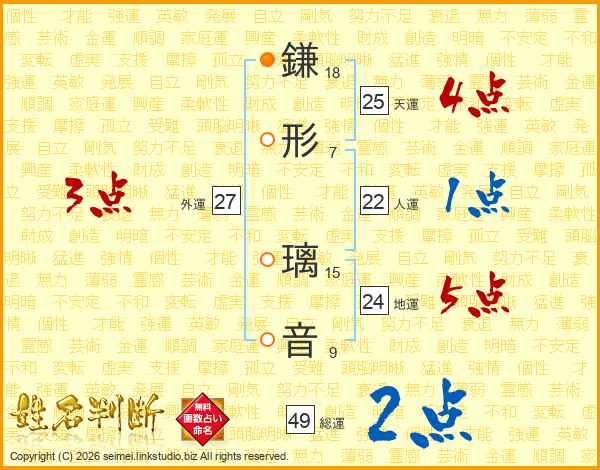 鎌(18画)形(7画) 璃(15画)音(9画)