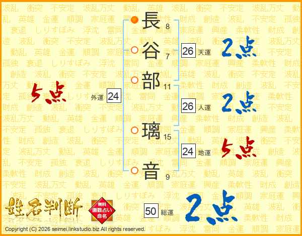 長(8画)谷(7画)部(11画) 璃(15画)音(9画)
