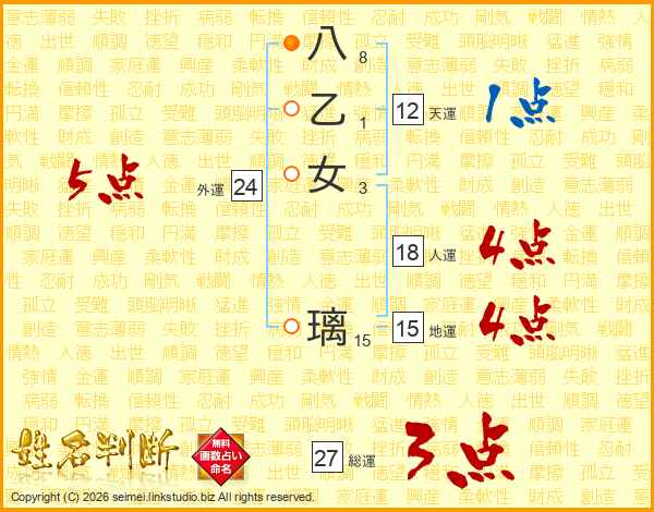 八乙女璃さんの総運は27画の3点!