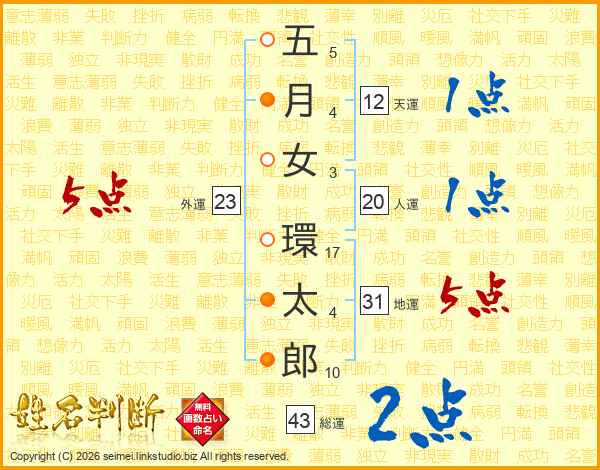 五(5画)月(4画)女(3画) 環(17画)太(4画)郎(10画)