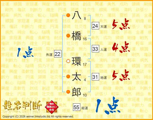 八(8画)橋(16画) 環(17画)太(4画)郎(10画)