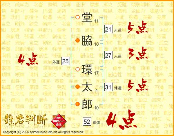 堂(11画)脇(10画) 環(17画)太(4画)郎(10画)