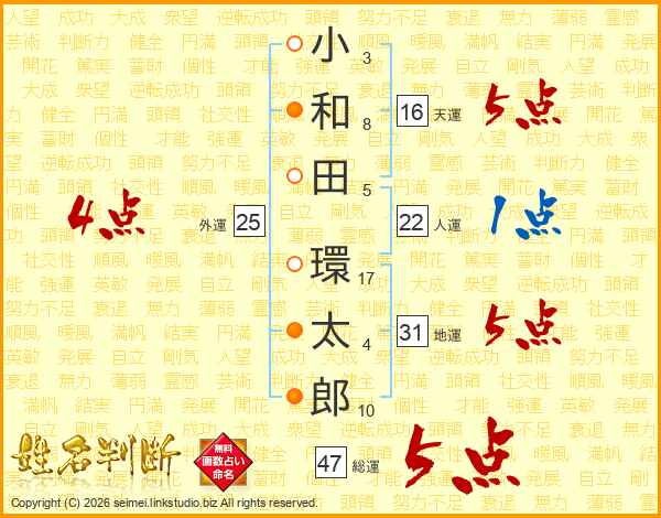小(3画)和(8画)田(5画) 環(17画)太(4画)郎(10画)
