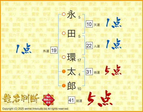 永(5画)田(5画) 環(17画)太(4画)郎(10画)