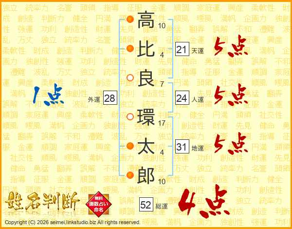 高比良環太郎さんの総運は52画の4点!